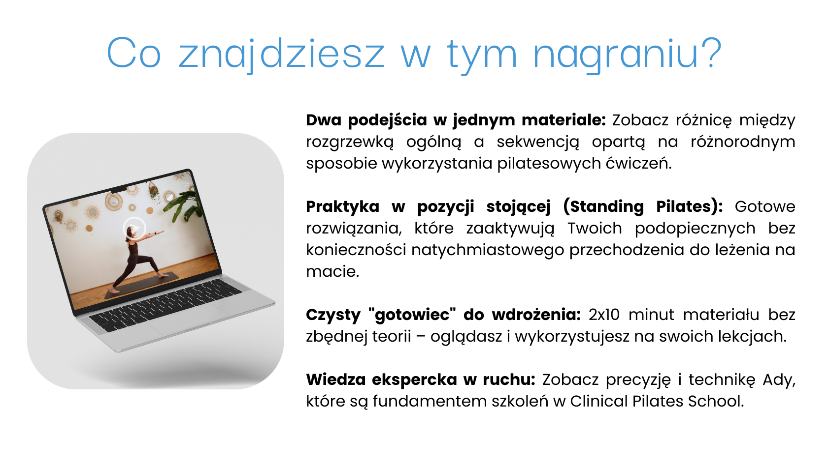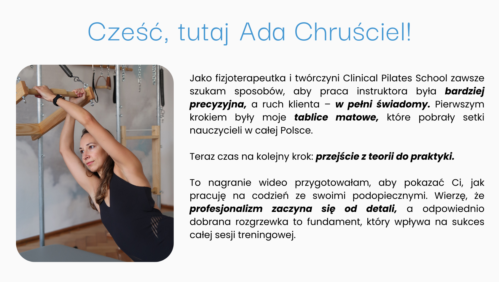 Wyrażam zgodę na przetwarzanie moich danych osobowych (imię i adres e-mail) w celu otrzymywania informacji marketingowych, w tym treści edukacyjnych, ofert i informacji handlowych drogą elektroniczną. Administratorem danych jest Clinical Pilates School Mateusz Chruściel. Zgodę mogę wycofać w dowolnym momencie.